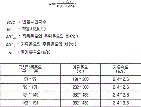 감지부를 다음표의 공칭작동온도구분에 따라 별표1에 의한 RTI시험장치에서 시험한 경우 다음 식으로 산정되는 반응시간지수(RTI)는 350이하 이어야 한다.