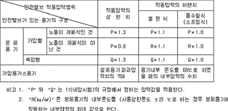 ② 안전밸브는 다음 표 좌측에 정하는 용기의 구분에 따라 각각 해당되는 우측에 정하는 작동압력의 상한값 및 하한값의 범위의 압력에서 작동하는 것이어야 한다.