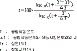 감지부는 공칭작동온도의 125 % 온도와 풍속 1 m/s의 수직기류에 투입하는 경우 다음 식으로 산정되는 시간(t) 이내에 작동되어야 한다.
