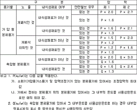 제16조(내압시험) ① 충압부 등의 구분에 따라 다음 표의 제1압력에 해당하는 수압력을 충압부에 서서히 가하여 5분간 유지하는 경우에 누설되지 아니하고 손상 또는 변형이 생기지 아니하여야 한다. 다만, 안전밸브 등의 안전장치가 없는 경우에는 제2압력에 해당하는 수압력을 가하여 시험한다.