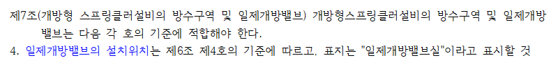 나. 일제개방밸브실의 설치 그리고 해당 조항에서 실내에 설치하라고 하는 의미는 단순히 건물의 내부에 설치하라는 것만을 의미하는 것이 아닙니다. 다른 장소와 구분되는 별도의 유수검지장치실 즉 일제개방밸브실을 설치하라는 의미로 받아들여야 합니다. 일제개방밸브 전용실을 설치함으로써 동파로 부터 보호하고, 불특정 다수인의 호기심 또는 장난에 의한 오작동을 막기 위한 조치입니다.