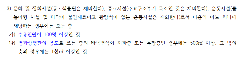 ② 다만, 해당 용도의 수용인원이 100명 이상이거나 일정규모 이상의 영화상영관의 용도로 사용되는 경우라서 스프링클러설비를 설치해야 하는 대상이 될 수 있습니다.