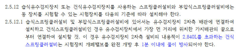 건식 유수검지장치의 2차측 배관의 내용적이 2,840ℓ를 초과하는 경우에는 시험장치를 개방한 후 소화수가 방사되는 시간이 1분 이내여야 한다고 규정하고 있습니다. 즉 건식 유수검지장치로부터 가장 멀리 있는 가지배관의 헤드가 개방되더라도 Trip Time과 Transit Time을 감안하더라도 1분 이내에는 소화수가 방수될 수 있도록 하라는 의미입니다.
