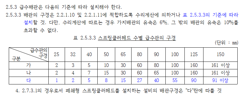 설치된 개방형 헤드 수가 30개 이하까지는 “다”란의 헤드 수에 따라 급수배관을 적용합니다. 규약배관 방식을 사용해도 된다는 의미입니다. 그러나 설치된 개방형 헤드 수가 30개를 초과하면 규약배관 방식의 표를 적용하지 말고, 수리계산을 통해 급수배관의 구경을 산정하라는 의미입니다.