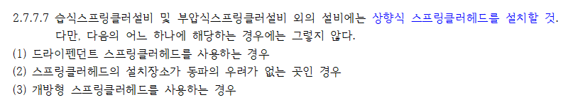 습식 스프링클러설비와 부압식 스프링클러설비가 아닌 설비는 상향식 스프링클러헤드를 설치하라는 의미이다. 결국 건식 스프링클러설비와 준비작동식 스프링클러설비를 말하고 있다. 일제살수식 스프링클러설비는 개방형 헤드를 사용하므로 이 규정이 의미가 없다.