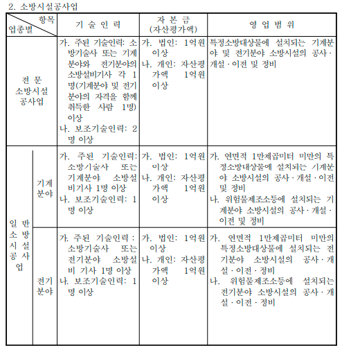 ① 특정소방대상물의 소방시설공사등을 하려는 자는 업종별로 자본금(개인인 경우에는 자산 평가액을 말한다), 기술인력 등 대통령령으로 정하는 요건을 갖추어 특별시장ㆍ광역시장ㆍ특별자치시장ㆍ도지사 또는 특별자치도지사(이하 “시ㆍ도지사”라 한다)에게 소방시설업을 등록하여야 한다.