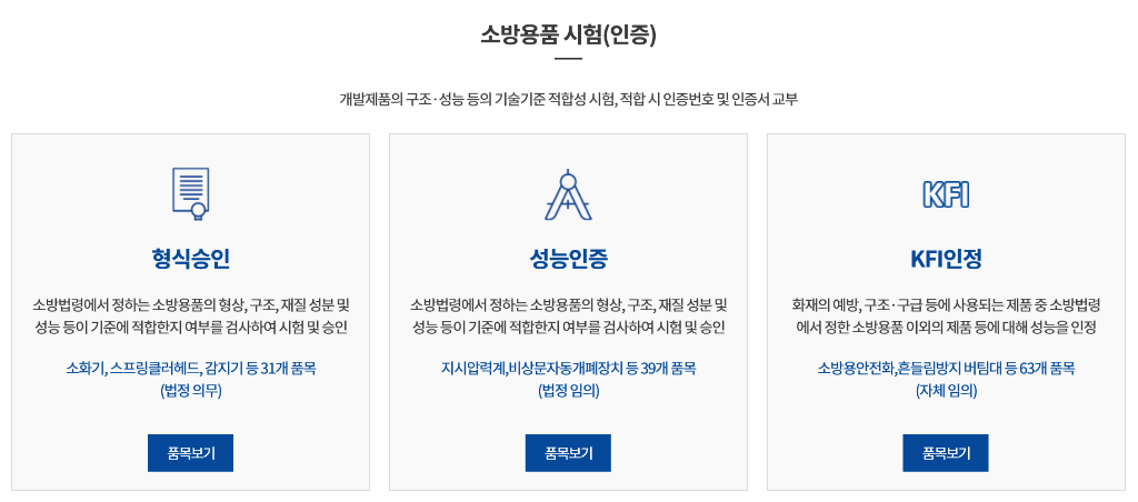 성능인증이란 소방용품에 대해 국가가 정한 성능이 있음을 인증하는 제도로 강제 의무는 아닙니다. 소방용품을 제조하는 사람 또는 수입하는 업자 등 신청인이 요청하는 경우에 성능시험을 실시하여, 해당 제품이 성능인증 기준에 적합한지 여부를 인정해 주는 것이라고 생각하면 됩니다. 화재예방, 소방시설 설치·유지 및 안전관리에 관한 법률 제39조에서 특정 소방시설 품목에 대해 성능인증을 받은 제품을 사용하도록 규정하고 있다. 또한, 성능인증을 받은 자는 그 소방용품에 대하여 소방청장이 실시하는 제품검사를 받아야 한다.