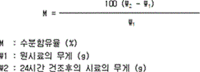 3. 상대습도가 50 % 이하인 대기 중에서 시료를 칭량하여 농도 95 % 내지 98 %의 농황산을 건조제로 사용한 데시게이터 내에 18 ℃ 내지 24 ℃의 온도로 24시간 놓아둔 후 칭량하여 아래 수식으로 계산한 수분함유율이 0.2 wt % 이하이어야 한다.