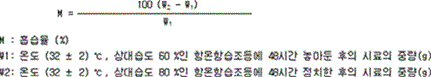 4. 온도가 (30 ± 2) ℃이고 상대습도가 60 %인 항온항습조등에 48시간 놓아둔 후 칭량하고, 다시 온도가 (30 ± 2) ℃이고 상대습도가 80 %인 항온항습조등에 48시간 놓아둔 후 칭량하여 아래의 수식으로 계산한 흡습율이 중탄산나트륨이 주성분인 것은 0.2 wt %, 중탄산칼륨이 주성분인 것은 2 wt %, 인산염류 등이 주성분인 것은 1.5 wt % 이하이어야 한다.