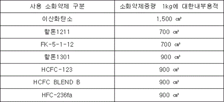 1. 내부용적은 다음표의 사용 소화약제 구분에 따라서 정한 값 이상이어야 한다.