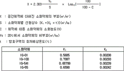가. 소화약제 저장용기의 온도는 (20 ± 2) ℃로 유지되어야 하며 신청농도에 의한 소화약제의 저장량은 다음 식에 의하여 얻어진 것으로 한다.