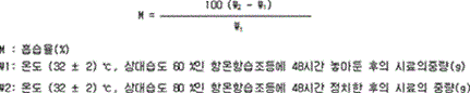 4. 온도가 (30 ± 2) ℃이고 상대습도가 60 %인 항온항습조등에 48시간 놓아둔 후 칭량하고, 다시 온도가 (30 ± 2) ℃이고 상대습도가 80 %인 항온항습조등에 48시간 놓아둔 후 칭량하여 아래의 수식으로 계산한 흡습율이 중탄산나트륨이 주성분인 것은 0.2 wt %, 중탄산칼륨이 주성분인 것은 2 wt %, 인산염류 등이 주성분인 것은 1.5 wt % 이하이어야 한다.