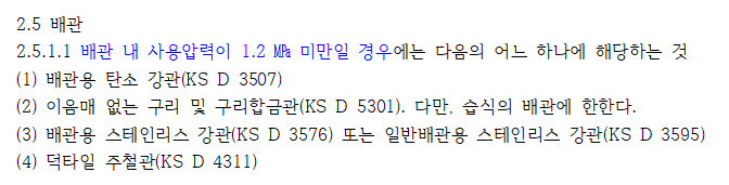 스프링클러설비에서는 배관 내 사용압력이 1.2Mpa을 기준으로 사용할 수 있는 배관의 종류를 구분하여 정하고 있다. 이 조건에서는 체절압력이 0.84Mpa로서 1.2Mpa 미만에 해당하므로 위 4가지의 배관 중 하나를 선택해서 사용하면 된다.