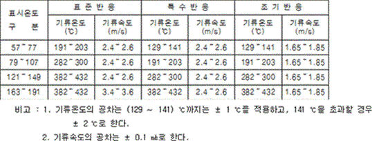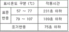퓨지블링크 구조의 폐쇄형헤드(상향형헤드는 제외한다)는 별도 15의 장치에 헤드를 설치하여 열반응시험을 실시하는 경우 아래 표에서 정한 기준에 적합하여야 한다.