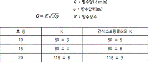 헤드는 방수압력 0.1메가파스칼(제곱센티미터당 1킬로그램)에서 방수량을 측정하는 경우 아래 식의 K의 값이 아래 표의 호칭구분에 따라 각각 그 해당 허용범위 내에 있어야 한다. 다만, 제17조, 제23조, 제26조의 적용을 받는 헤드의 방수량시험은 해당 기준에 따른다.