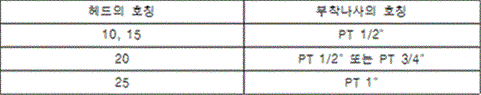 ② 헤드의 부착나사는 KS B 0222(관용 테이퍼 나사)중 다음 표의 헤드 구분에 따른 부착나사 또는 이에 상당하는 호칭 이상의 관용 테이퍼 나사이어야 하며, 보관ㆍ운반 등의 경우 손상되지 않도록 적합한 보호장치를 하여야 한다.
