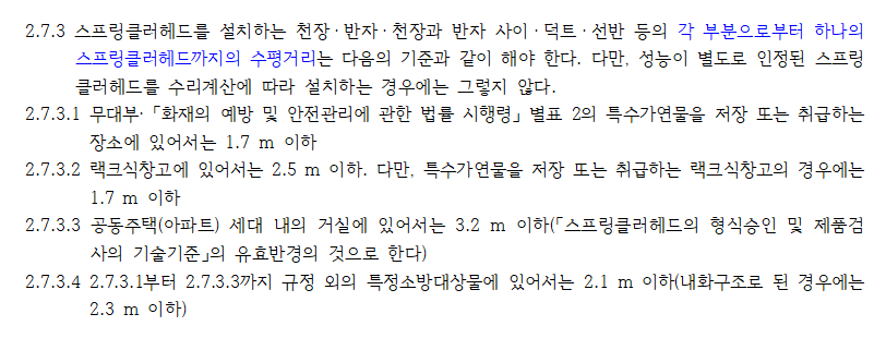 위 ‘나’에서 화재안전기술기준에서는 용도별로 수평거리를 적용함에 있어 각 용도별로 명확하게 수평거리 기준을 정하였습니다. 다만, 공동주택(아파트)의 경우에는 3.2m 이하라고 규정해 놓고, 스프링클러헤드의 형식승인 및 제품검사의 기술기준의 유효반경의 것으로 한다고 별도로 단서처럼 규정하고 있습니다.