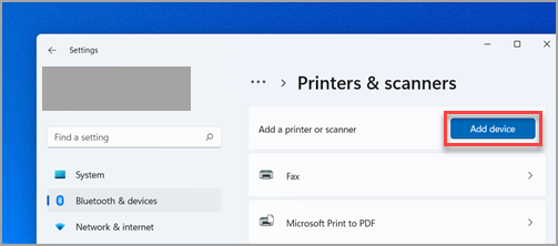 1. 프린터 & 스캐너를 > 시작 > 설정 > Bluetooth & 디바이스 를 선택합니다.