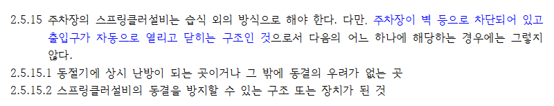 ① 주차장이 벽 등으로 설치되어 외기에 직접 접하지 않아야 하고, 주차장 출입구가 자동으로 열리고 닫히는 구조인 경우이다. 결국 물이 들어있는 배관이 겨울철에도 찬바람으로 인한 직접적인 영향을 받지 않아야 됨을 의미한다. 기본적으로 출입구를 제외한 모든 부분이 외기에 노출되는 부분이 없어야 하고, 출입구는 차량이 출입하는 경우를 제외하고는 자동으로 닫혀있어야 한다는 것을 의미한다.