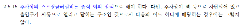 ② 이러한 구조로 된 주차장으로서 다음의 어느 하나에 해당하는 경우 습식의 방식인 스프링클러설비를 설치할 수 있다는 의미이다. 습식 방식으로된 스프링클러설비를 설치하고자 한다면, 이러한 외기와 차단될 수 있는 주차장의 구조가 전제조건인 것이다.