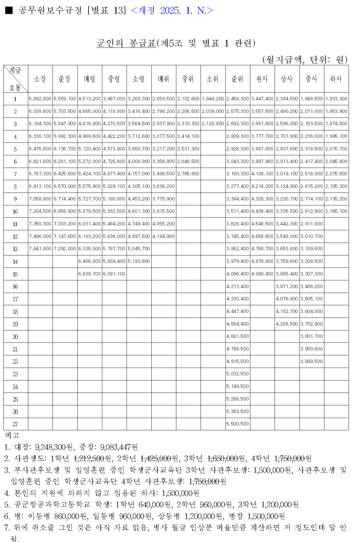 간부 월급은 **2025년 공무원 봉급 인상률(3.0%)**을 적용하며, 초급간부의 경우 추가로 6.6% 인상됩니다. 이를 통해 초급간부 처우가 대폭 개선될 예정입니다.